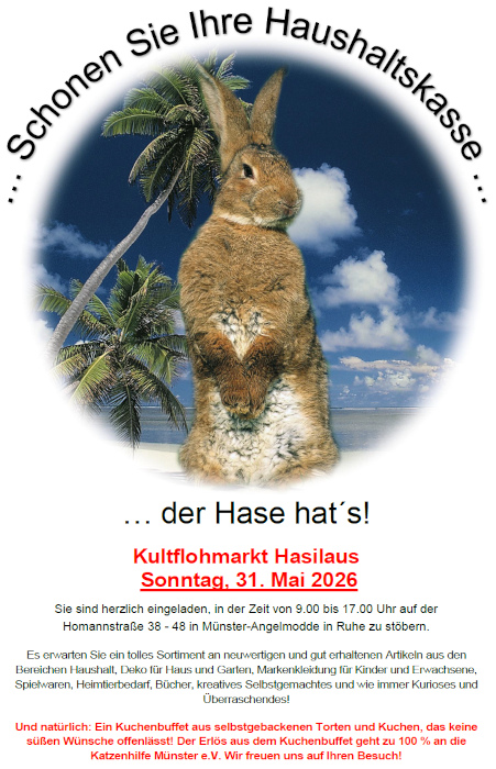 Am Sonntag, den 31. Mai 2026, findet in der Zeit von 09.00 Uhr bis 17.00 Uhr der Kult-Flohmarkt Hasilaus auf der Homannstr. 38 – 48
