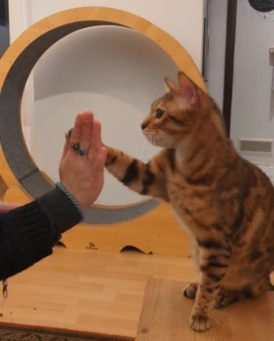 Kleine Kinder sollten nicht im Haushalt leben oder geplant sein, da reagiert er gestresst. Er liebt das Klickertraining, ein Laufrad mit Kugellager wäre auch etwas für ihn.